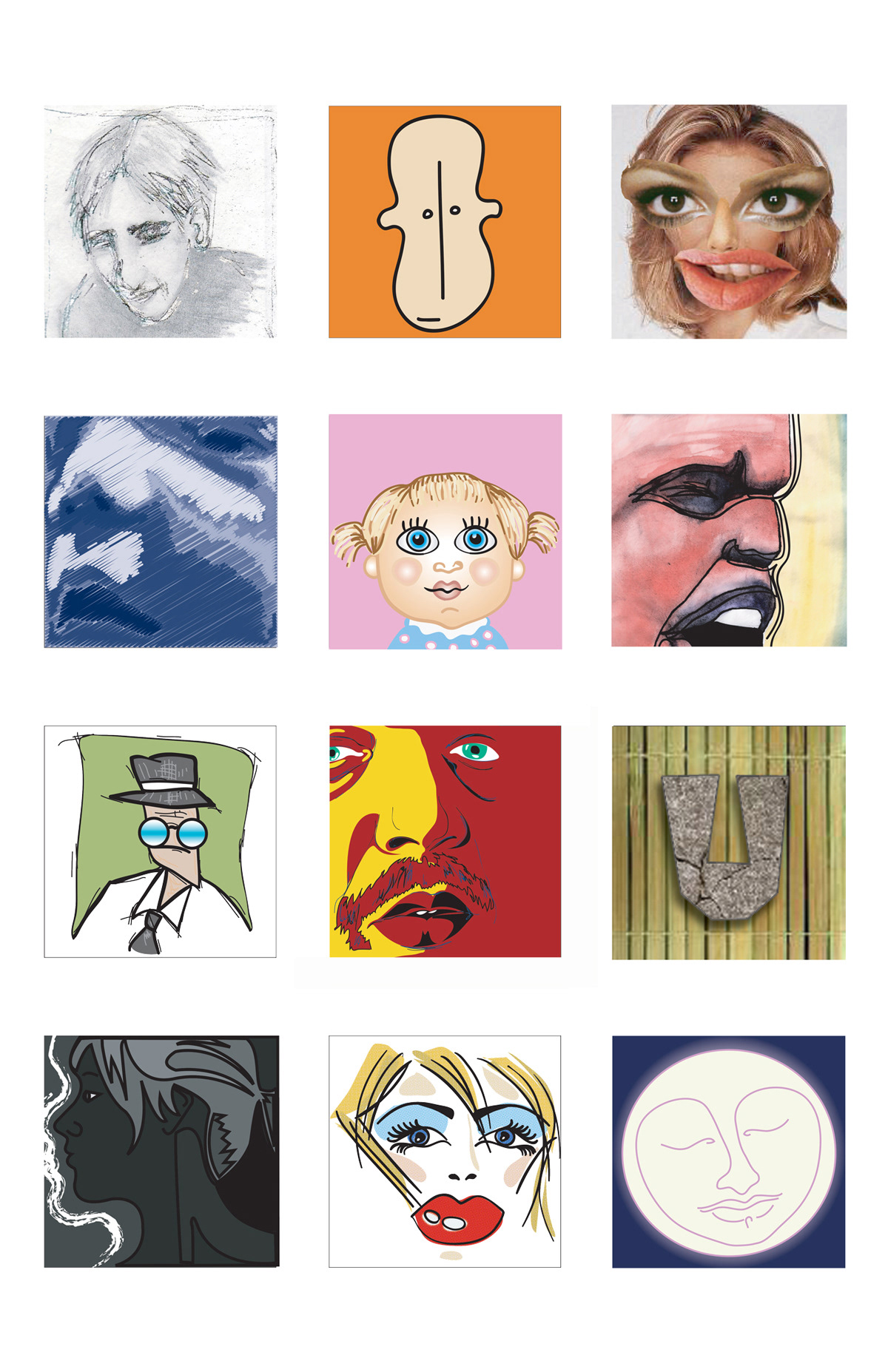 Student project from my Adobe Illustrator class at the Art Institute of Vancouver, we were asked to to a series of faces using different styles and techniques. Its just kind of goofy and fun.